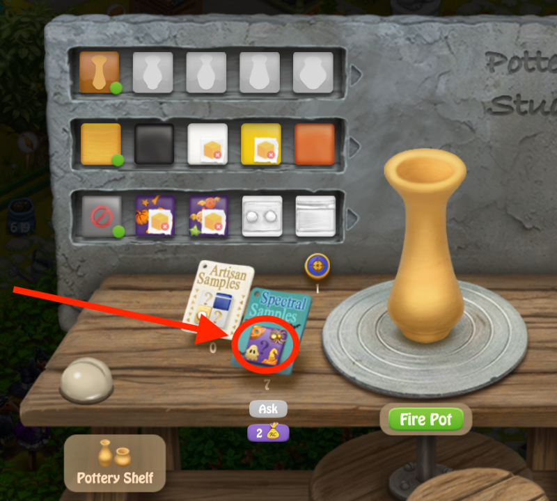 To convert Spectral Samples into Halloween Patterns, click on them from inside the Pottery Studio popup, after you select a Model. You can Ask your Neighbors for more or buy them directly from there too.