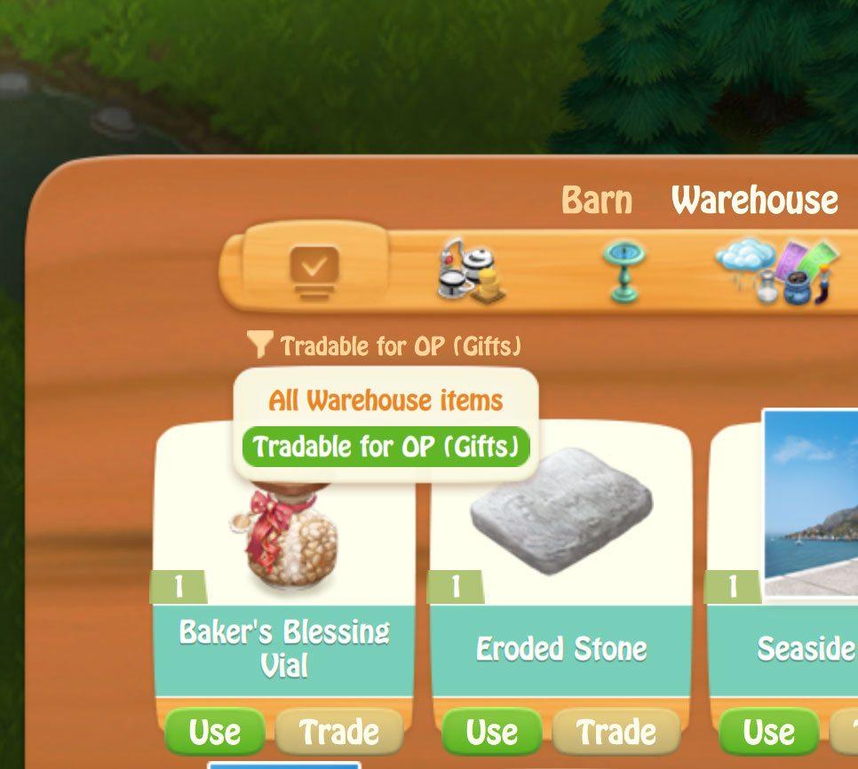 You’ll find your Gifts in the Warehouse now, and you can even filter ALL items that you can trade for OP (all Gifts plus other items from Events or from Flower Shop), so you can easily trade tem for OP. Or, type gifts in your Warehouse search bar.