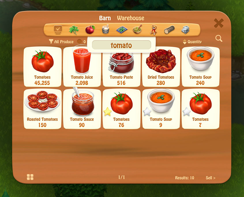 - in Barn you can type a Sauce Wiz, for example (a Gear), and it shows you all produce that is made by that Gear.