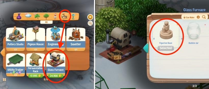 Make Figurine Bases in the brand-new Gear called the Glass Furnace, which you can buy from the Shop > Gear tab (page 6) for 24,900 Coins. If you’ve reached your limit for Gear, store an existing Gear with the Add to Warehouse Tool.