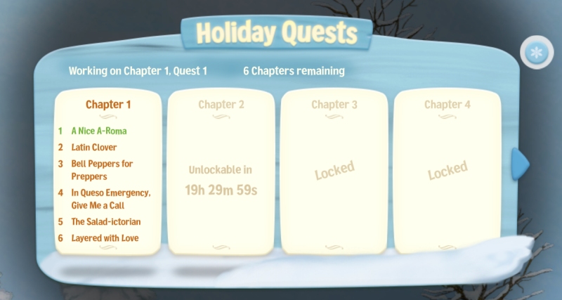 Open the Winter Event menu again, click the green “Open Contest” button under the Complete Holiday Quests part (Contest 3) and you will see the info clearer than ever before: what Quest you’re on, how many Quests are left in the current Chapter, and the time until the next Chapter is unlocked.