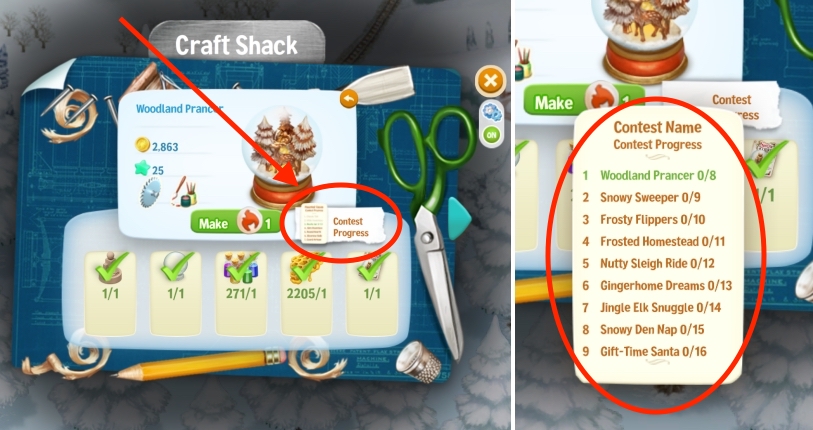 You must “practice” each of the 9 Snow Globes about a dozen times or so in order to make one fit on the Snow Globes Ice Mountain. You can also click the “Contest Progress” menu that appears in the Craft Shack and check your progress.